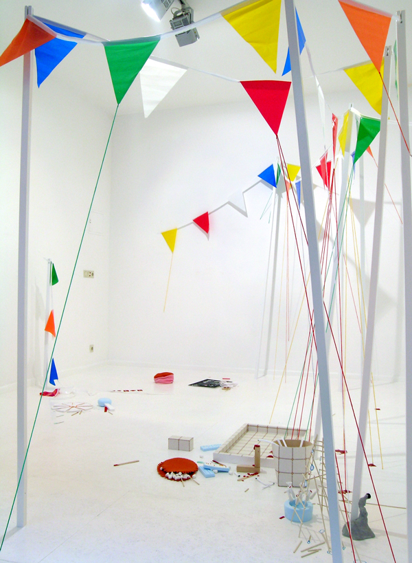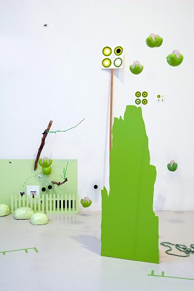 In 2003, with “Beneath such dreamy weather,” the artist began to expand her concept of installation and introduced an interactive component. From this point on, Löfke has created several works that present the viewers with concrete tasks they must fulfill to fully experience the work. For example, in “The squirrels, hedgehogs and rabbits are indeed harmless” (Michael Steinberg Gallery, NYC, 2007), the gallery space resembled a biosphere full of vegetation, architectural and abstract elements, blackboards, Band-Aids, pictures, signs, notes and drawings. Amidst these elements, all boasting an artificial green color, towered an eight-foot high platform, a deer stand. After ascending this structure, the viewer found at the top a soft welcoming cushion and a pair of binoculars with which the world around could be explored. The binoculars brought various details into focus and greatly enhanced the play of different scales: tiny trees growing out of a wall, targets referring to the viewer as hunter, abstract forms hanging from the ceiling, a mélange of inanimate and animate objects. Again, the at-first-glance idyllic scene beckoned the viewer to enter the space and (freed from the commitments of daily life) to linger, only to find an array of self-reflections spanning pleasant and concerning observations.