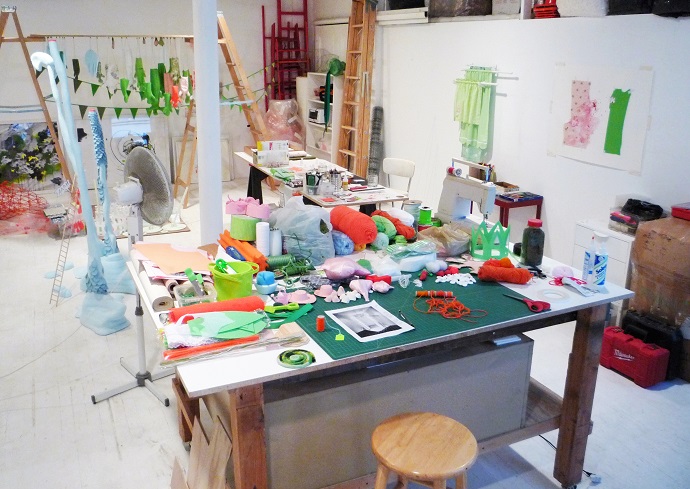 Materials, found, everyday objects and colorful, decorative supplies overflow the categorized shelves and bins in my studio. In fabricating these fairy-like worlds, I knit, cut, glue, sew, find, draw, construct, select, saw, paint, decorate, carve, combine and mold. Initially I begin the process of the work with a material, a feeling, a color, or a vague image. Obscure, intangible thoughts and sensations collect within my mind and my body and step-by-step the work evolves, develops while making. In my work I am going on a journey, seeking to surprise myself.